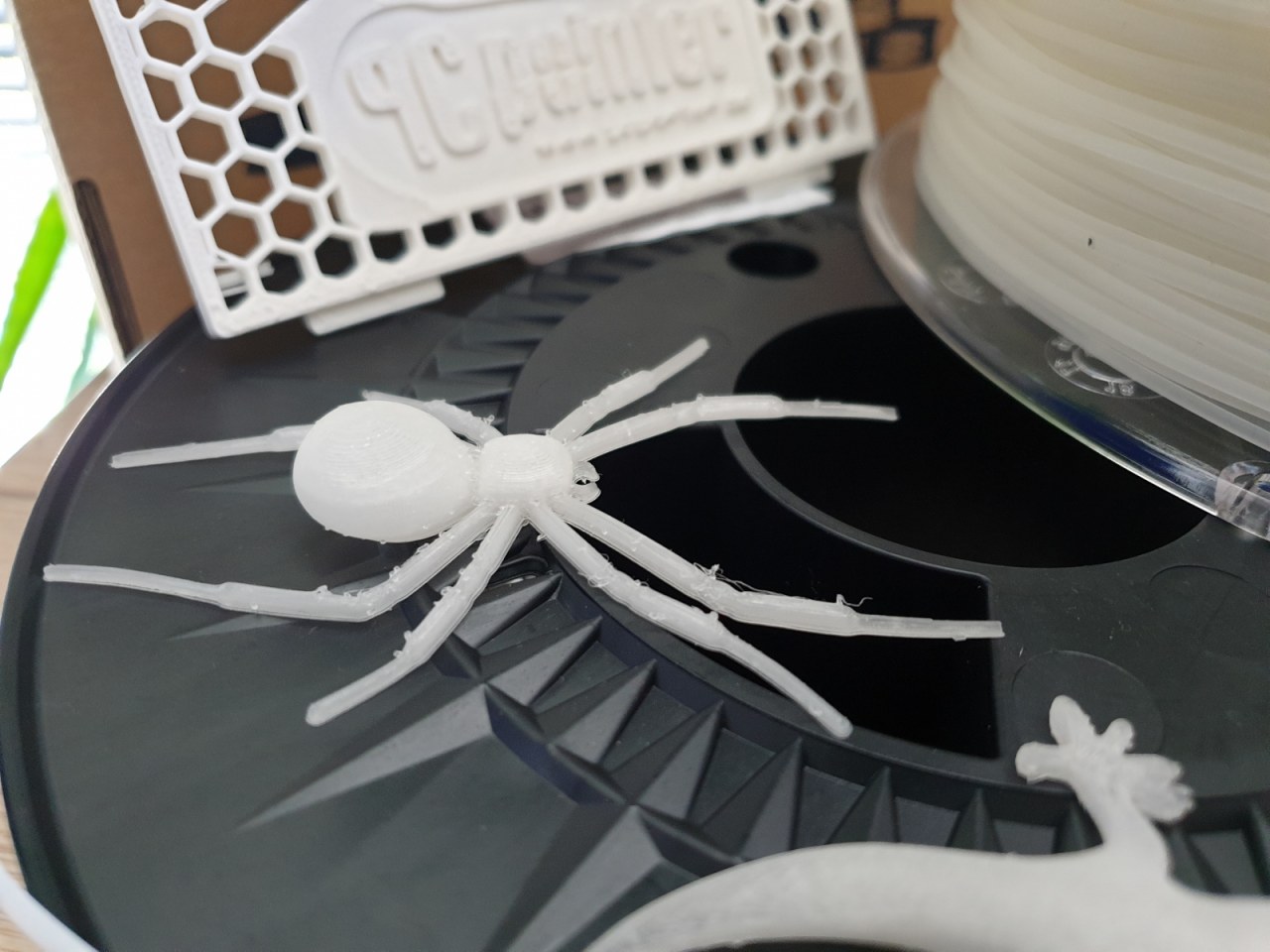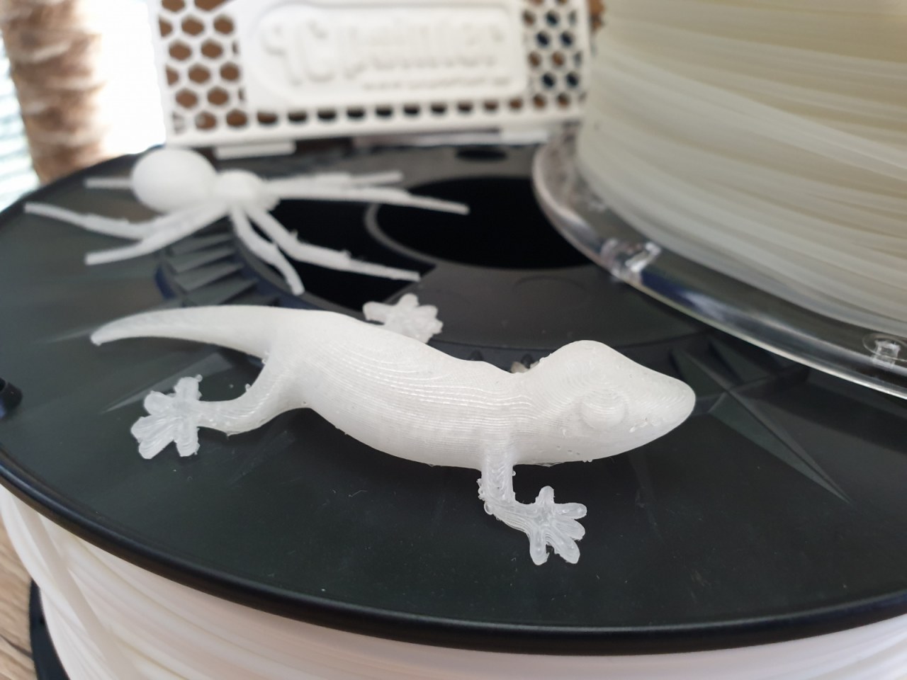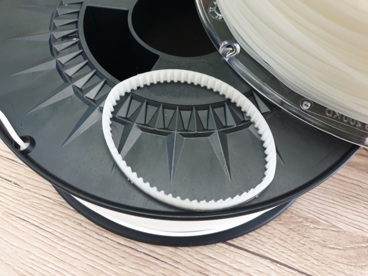 Das TPS von der Firma Herz GmbH lässt sich im Vergleich zu anderen flexiblen Materialien relativ schwer drucken. Das Material ist sehr weich, sodass insbesondere die Drucktemperatur und die Druckgeschwindigkeit angepasst werden müssen. Aber auch andere unscheinbare Faktoren können eine Rolle spielen. In unserem Fall wurde das Filament zunächst nicht korrekt gefördert und wickelte sich um das Extrudergetriebe. Nach einigen Testdurchläufen mussten wir feststellen, dass der automatische Filamenteinschub das Material mit einer viel zu hohen Geschwindigkeit einzieht. Das TPS wird zwar extrudiert, gleichzeitig aber zwischen Extruderantrieb und Hotend gestaucht.