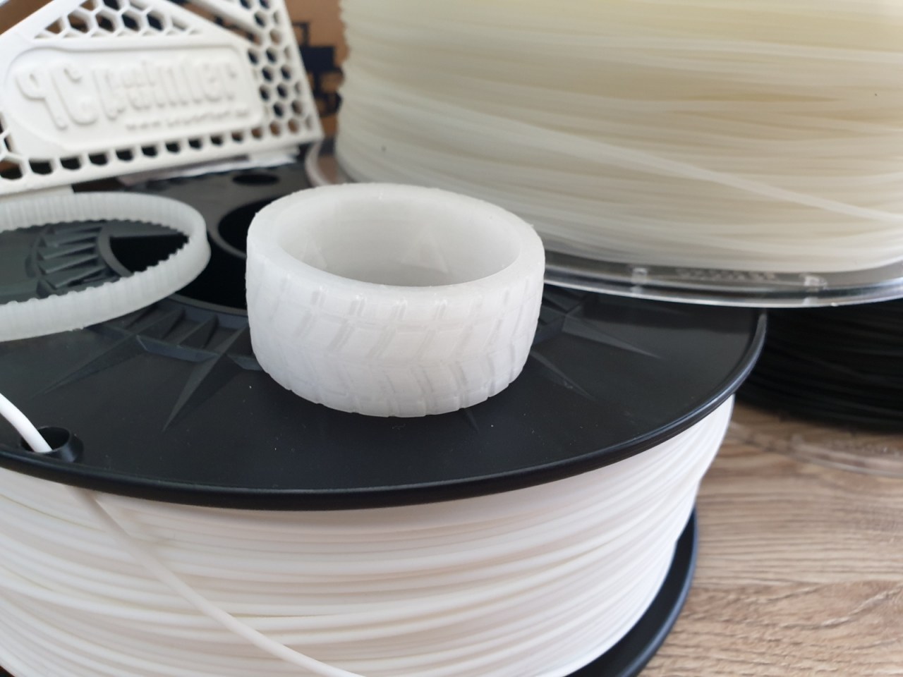 Mit TPS-Filament können flexible Komponenten wie Smartphone-Hüllen, Dichtungen und RC-Reifen gedruckt werden. Die Anzahl der Konturen und die Fülle bestimmen die Flexibilität und den den Reibungskoeffizienten.
