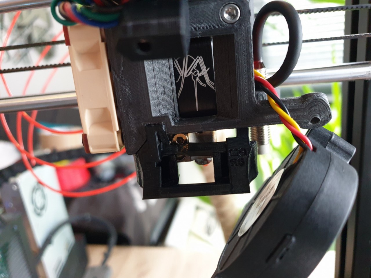 Für die Montage des Mosquito Hotends sind am schwarzen Aluminiumkühlkörper zwei Gewindebohrungen (M2,5 x 0,45) und zwei Senkbohrungen (M2,5 x 0,45) für die Montage vorgesehen. Für die Montage an der Unterseite sind zwei Gewindebohrungen (M2,5 x 0,45) vorhanden. Jedes dieser drei Lochpaare kann mit Innensechskantschrauben M2,5×0,45, die im Lieferumfang enthalten sind, an die Extruderteile befestigt werden.