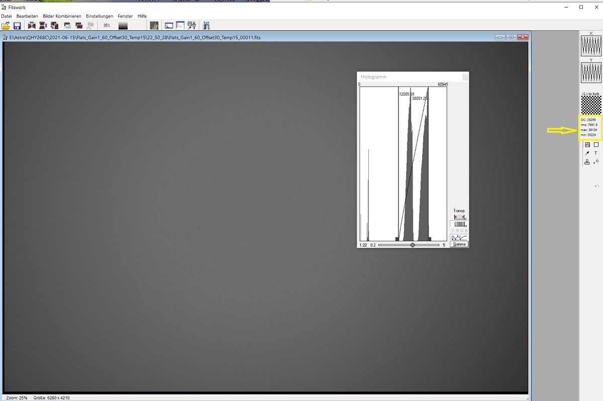 Der FBC eignet sich aber auch wunderbar, um Flats mit einer Astrokamera zu erstellen. Denn die Flatfieldbox ist dermaßen hell, das Belichtungszeiten über 1/60s kaum möglich sind, ohne in die Sättigung zu rutschen. Bei der QHY 268C verwenden wir einen Gain von 0 und Belichtungszeiten von 1-2s. Die Helligkeit passen wir mithilfe eines Flatfieldbox-Dimmers an.