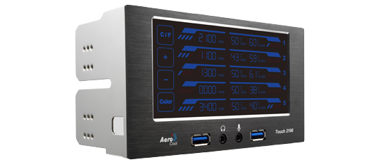 Das Touch-2100 wird dank innovativer LCD-Touch-Technologie mit dem Finger bedient. Das LC-Display ist 5 Zoll groß und weißt einen gebürsteten Rahm auf. Darüber hinaus wurden zwei USB 3.0 Anschlüsse sowie je einen Kopfhörer- und Mikrofonanschluss. Das Touch-2100 unterstützt bis zu maximal 25 W pro Kanal und bietet insgesamt 5 Kanäle, über die man die Temperaturen und Lüftergeschwindigkeiten überwachen und steuern kann. Die LCD-Hintergrundbeleuchtung ist an- und abschaltbar und bietet insgesamt sieben verschiedene Farben. Auch ein Wechsel der Temperatureinheit zwischen Celsius und Fahrenheit ist möglich. Bei Überhitzung wird ein Alarm ausgegeben, die voreingestellte Alarmtemperatur beträgt 70 °C.
