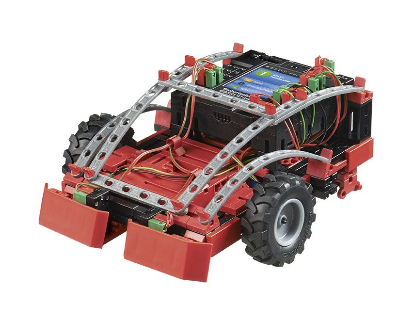 Inkl. ROBOTICS TXT Controller, Steuerungs-Software ROBO Pro (System: Windows XP, Vista, 7, 8, 10), USB-Kamera (1 MP), 2x Encoder-Motor, XS Motor, 2x LED, 2x Taster, Fototransistor, NTC-Widerstand.