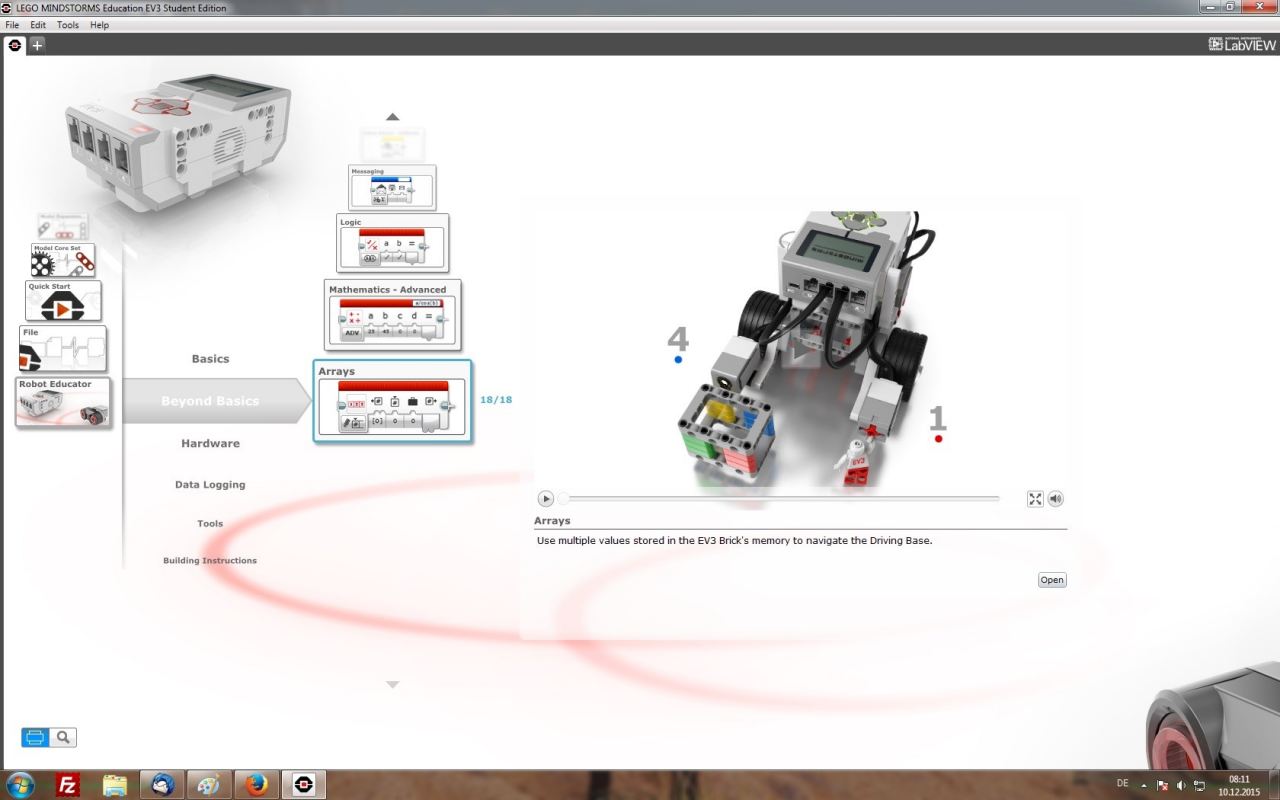 Herzstück des EV3 Basis-Sets ist der intelligente EV3-Stein – ein kleiner, kompakter und programmierbarer Computer. Zusammen mit der intuitiv bedienbaren Programmiersoftware und der Software für Messdatenerfassung (beide im Set enthalten) erlaubt der EV3-Stein das Steuern von Motoren sowie die Erfassung und Verarbeitung von Sensordaten.