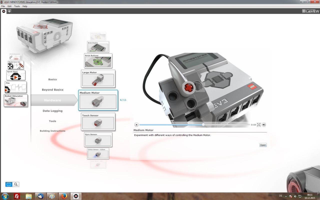 Herzstück des EV3 Basis-Sets ist der intelligente EV3-Stein – ein kleiner, kompakter und programmierbarer Computer. Zusammen mit der intuitiv bedienbaren Programmiersoftware und der Software für Messdatenerfassung (beide im Set enthalten) erlaubt der EV3-Stein das Steuern von Motoren sowie die Erfassung und Verarbeitung von Sensordaten.