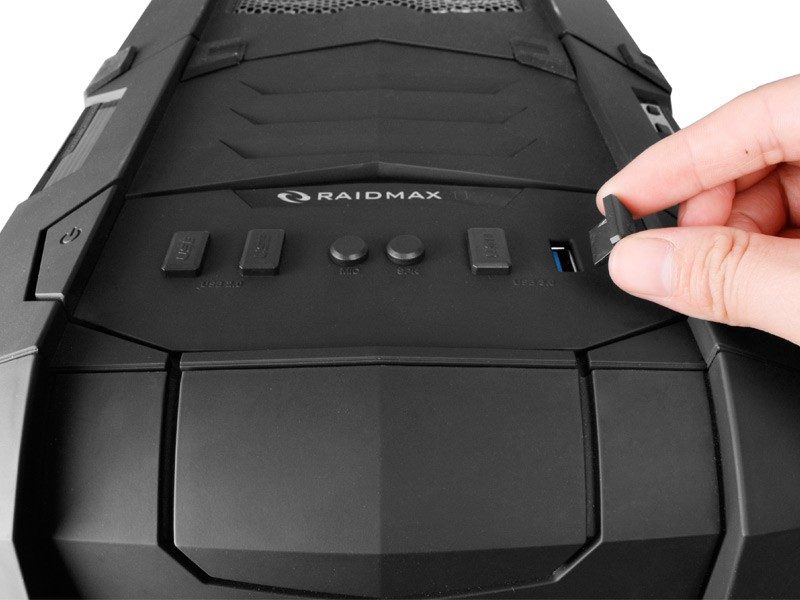 RAIDMAX präsentiert mit dem Vampire einen hochwertigen Full-Tower, der sich im oberen Portfolio des US-Unternehmens einordnet. Besonders auffällig sind das futuristische Design und die umfangreiche LED-Beleuchtung. Das I/O-Panel bietet je zwei USB-3.0- und USB-2.0-Ports, einen Kopfhöreranschluss und eine Mikrofon-Buchse. Dazu kommt eine kleine Lüftersteuerung, mit der die vorinstallierten LED-Lüfter geregelt werden können. Für besonders anspruchsvolle Gamer gibt es sogar die Möglichkeit, eine externe Wasserkühlung zu installieren.