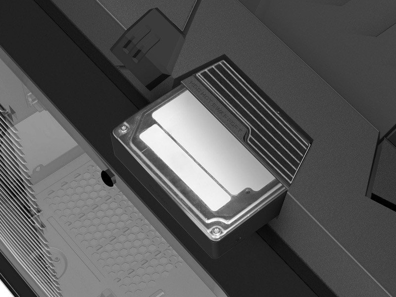 RAIDMAX präsentiert mit dem Vampire einen hochwertigen Full-Tower, der sich im oberen Portfolio des US-Unternehmens einordnet. Besonders auffällig sind das futuristische Design und die umfangreiche LED-Beleuchtung. Das I/O-Panel bietet je zwei USB-3.0- und USB-2.0-Ports, einen Kopfhöreranschluss und eine Mikrofon-Buchse. Dazu kommt eine kleine Lüftersteuerung, mit der die vorinstallierten LED-Lüfter geregelt werden können. Für besonders anspruchsvolle Gamer gibt es sogar die Möglichkeit, eine externe Wasserkühlung zu installieren.