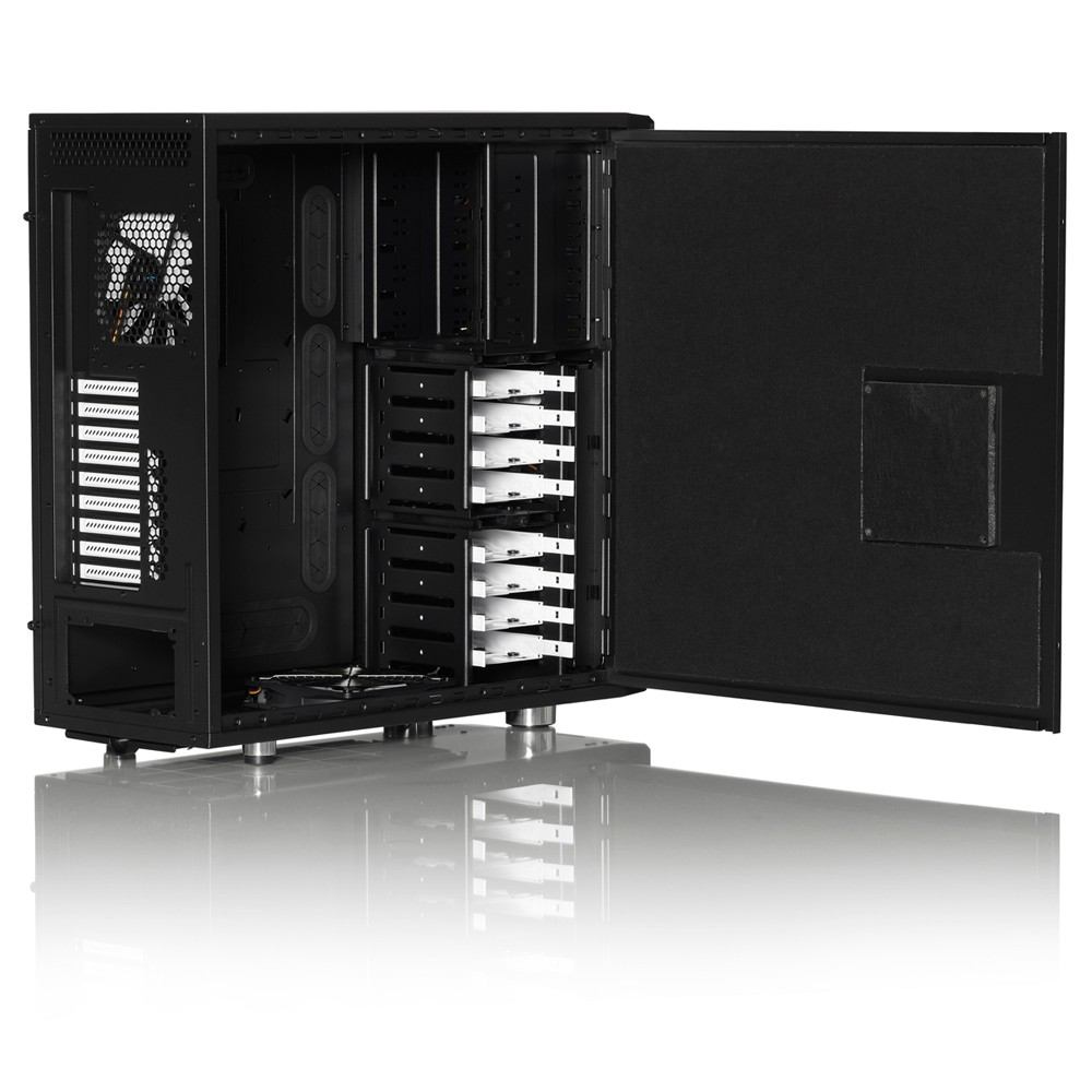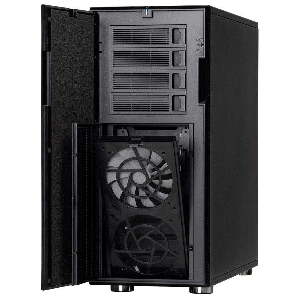 Die Gehäusefront wird von einer massiven Fronttür, die aus Kunststoff besteht und mit einer Einlage, welche an gebürstetes Aluminium angelehnt ist, versehen wurde, dominiert. Die Innenseite der Tür wurde mit Schalldämmmaterial beklebt und verfügt zusätzlich über einen Magneten, um die Fronttür geschlossen zu halten. Hinter der Fronttür verbergen sich vier 5,25-Zoll-Laufwerksplätze. Daneben sitzt eine kleine Lüftersteuerung, die in den Stufen 5, 7 und 12 Volt regelbar ist. Im unteren Bereich sitzen hinter der Lüfterabdeckung, die werksseitig mit einem Staubfilter versehen wurde, zwei vorinstallierte 140-mm-Lüfter. Die Lüfter sind aber nicht verschraubt, sondern in einem herausnehmbaren Rahmen eingeklipst. Der Abstand zwischen den Lüftern und der Fronttür beträgt ca. 2-3 cm, wobei ein Großteil der Frischluft durch die seitlichen Luftschlitze ins Innere des Gehäuses gelangt.
