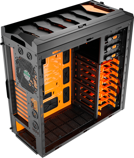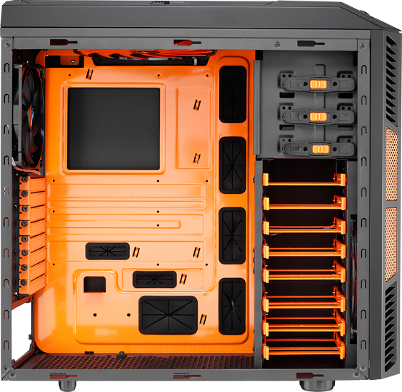 Der Innenraum ist sehr sauber verarbeitet und bietet reichlich Platz für überdimensionale CPU-Kühler, zusätzliche Gehäuselüfter und Laufwerke. Auch hier finden sich schicke orangene Farbakzente, die sofort ins Auge stechen.